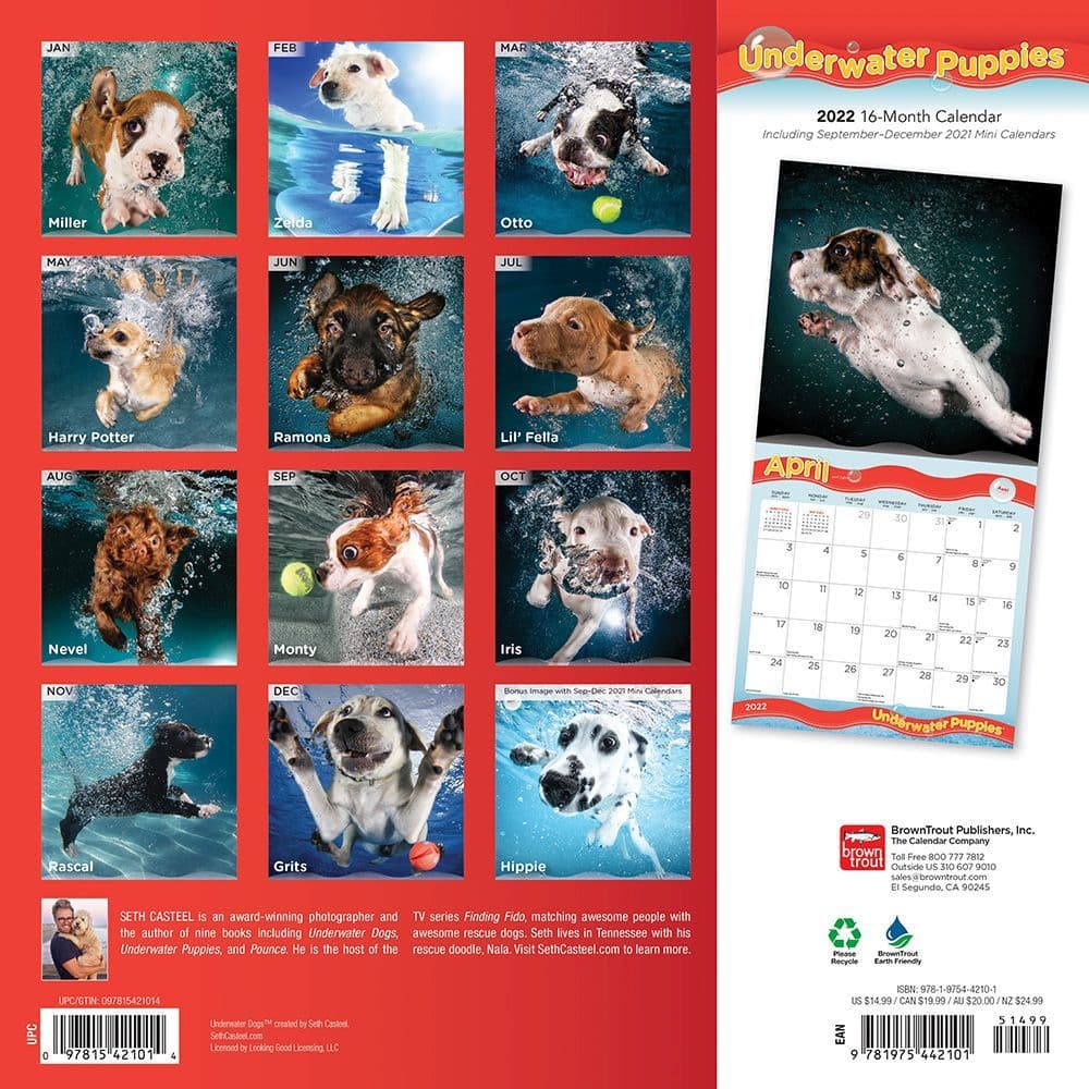 Calendars are not returnable. 2022 Underwater Puppies Calendar. The Underwater Dogs calendar makes a perfect gift for those who enjoy an alternative yet ever-delightful view of our most loyal friends. 2022 Calendars Underwater Dogs 2022.